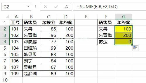 2.根据销售人员找到年终奖。