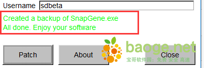2、安装完成后,将安装包中的crack文件夹下的SnapGene_2.3.2_Windows_Crack.exe复制到软件安装目录中,双击运行,输入用户名,点击patch。