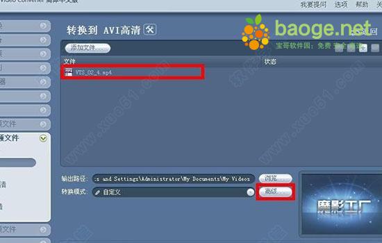 3、选择好输出格式后就会返回到魔影工厂界面,这个时候我们点击“浏览”选择一下输出视频的保存位置,选择完毕后再点击“高级”按钮;