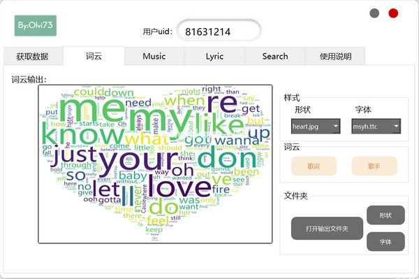 选择合适的形状和字体,点击歌词或歌手,生成词云。您可以在“形状和字体”文件夹中添加您喜欢的形状图片或字体文件。